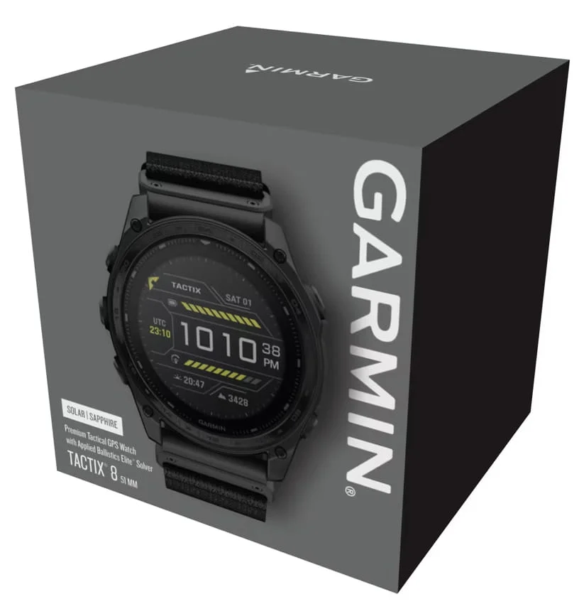 Tactix 8 es un smartwatch táctico con pantalla AMOLED, bisel de titanio, cristal de zafiro, altavoz y micrófono internos y resistente al agua hasta 40 metros e incluye la calculadora Applied Ballistics revestimiento Cerakote.